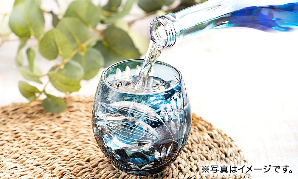 清涼感溢れる深いブルーのグラスは、焼酎ボトルとの相性もぴったりです。
